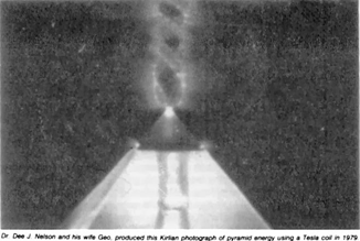 “Dr. Dee J. Nelson and his wife Geo produced this Kirlian photograph of pyramid energy using a Tesla coil in 1979”